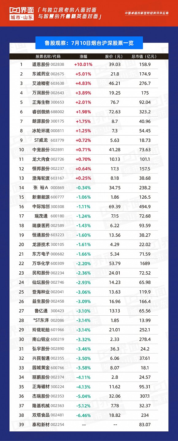 烟台市涨幅榜首:道恩股份(002838),涨幅10.01%,股价39.03元,总市值158.9亿元;
