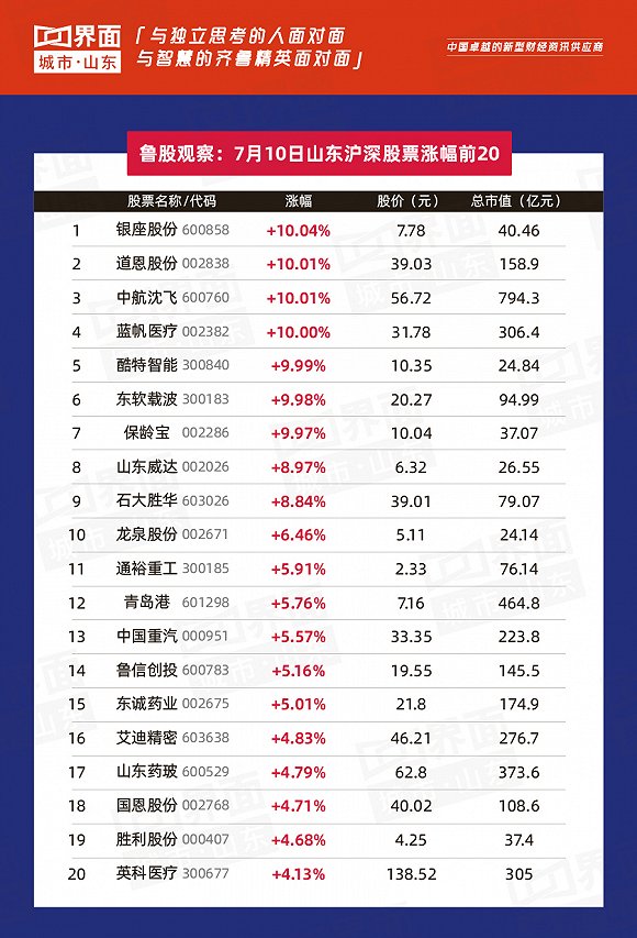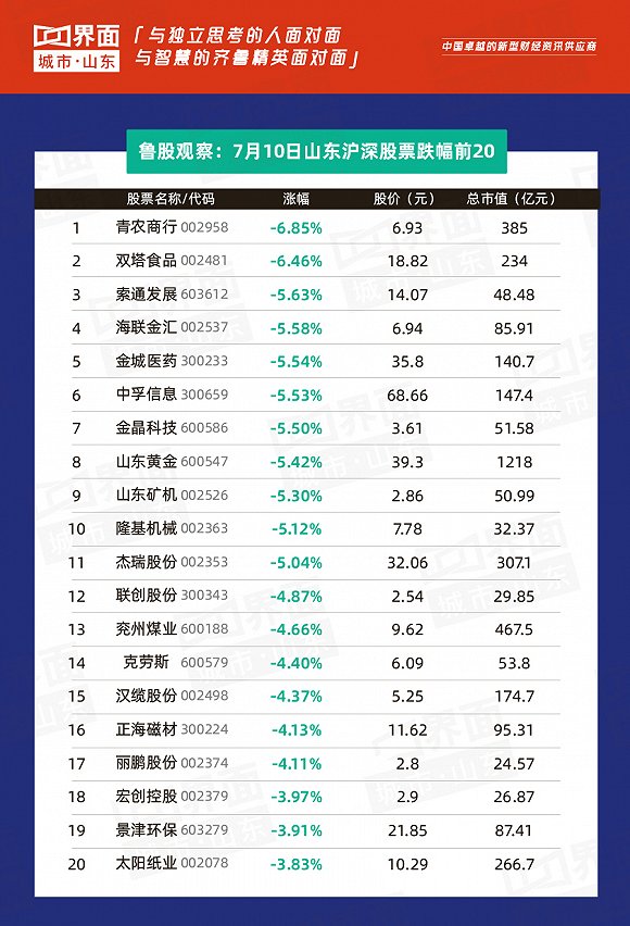 今日鲁股总结:7月10日,山东省内沪深股票有71只个股上涨,140只下跌,4只与上一个交易日收盘价持平;